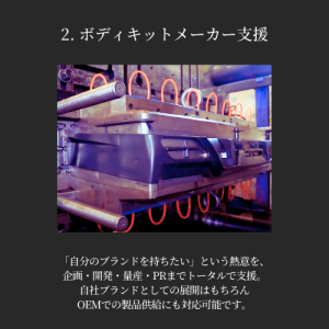 ボディキットメーカー設立に向けた支援が『Modeling Studio R』のもうひとつの重要な業務です。樋江井がコンダクター(指揮者)となり、これからボディキットメーカーを起業しようという方々を成功へと導きます。
